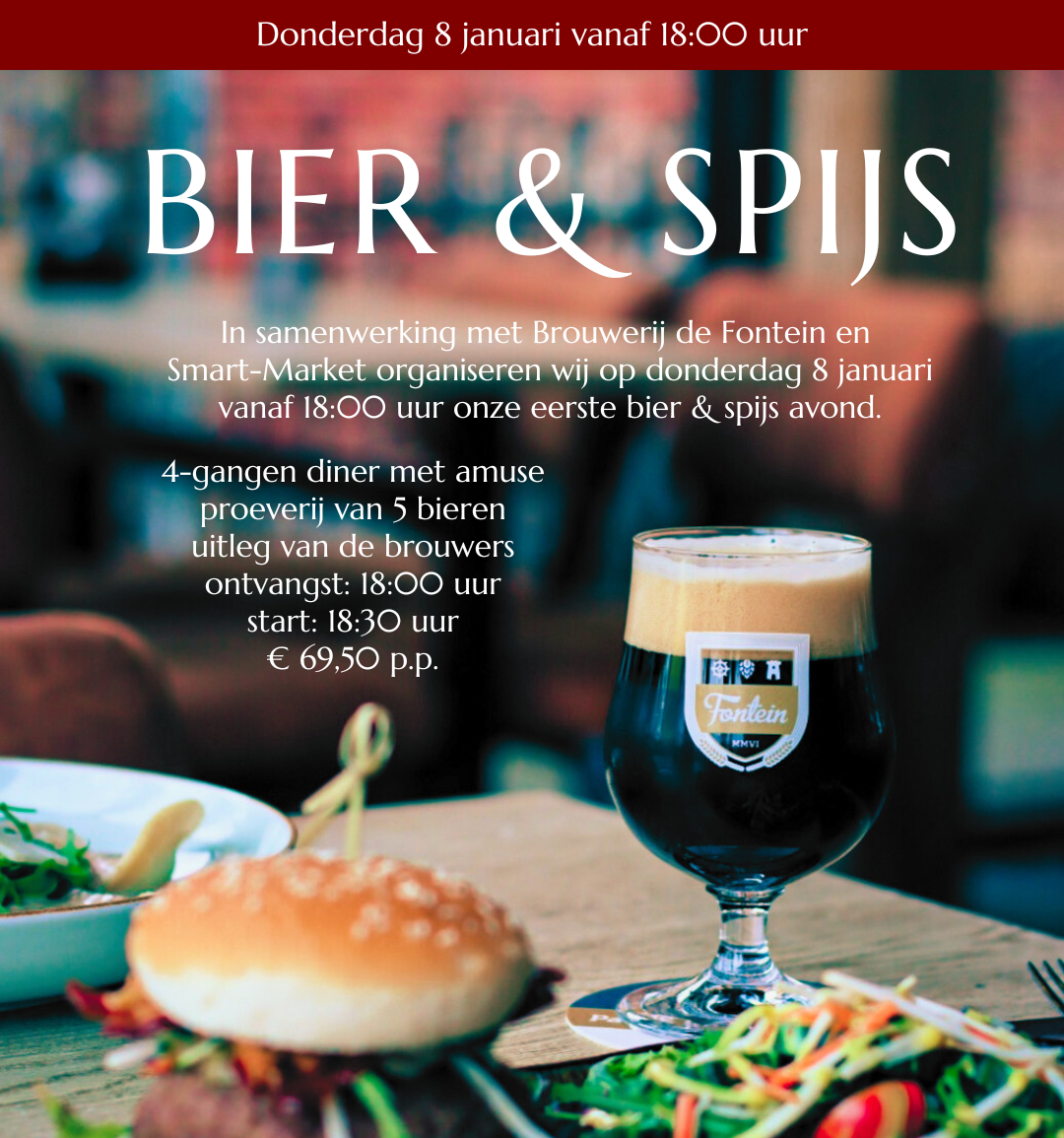 Op donderdag 8 jan. organiseren wij vanaf 18:00 een bier & spijs avond. In samenwerking met Smart-market en onze buren Brouwerij de Fontein verzorgen wij een avond vol met verschillende biertjes en een bijpassend 4-gangen menu.